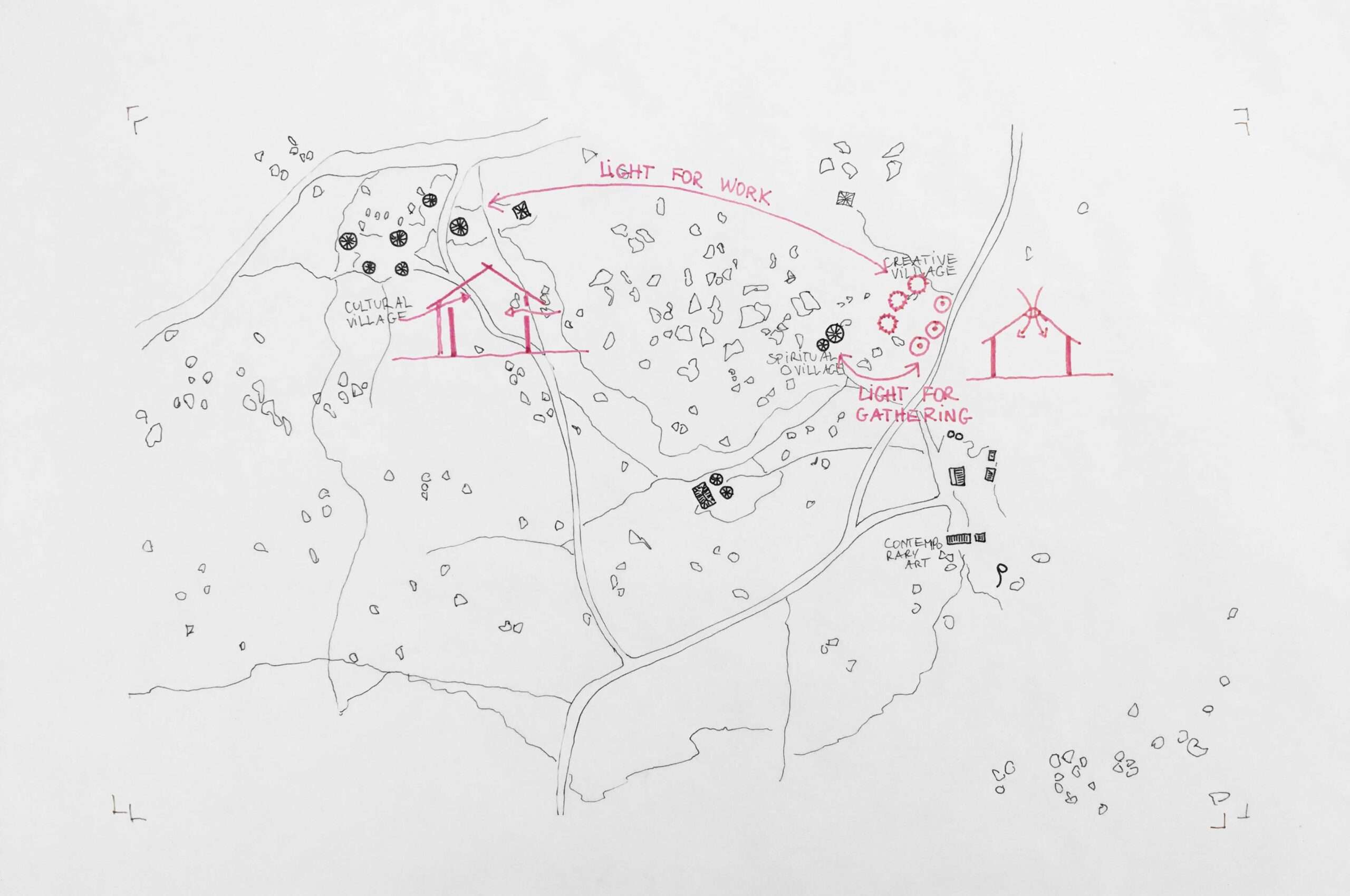Das Creative Village ist eine einzigartige gebaute Umgebung für kreatives Schaffen und Ausstellungen, die den Metaphern und dem spirituellen Wesen der Architektur indigenen Wissens entspricht und gleichzeitig Neues in die Welt der zeitgenössischen Architektur bringt.